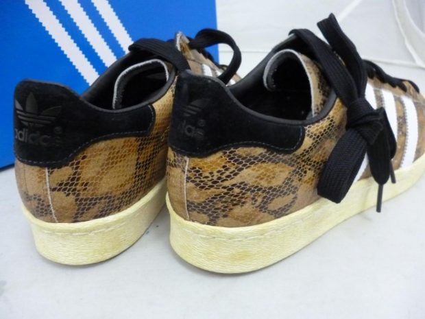 アディダスの定番モデルあるスーパースターSUPER STARをベースに使用しアッパーは艶めかしいスネークスキンを使用。サイドのスリーストライプはホワイトレザー、ヒールカウンターはブラックのヌバックで構成。またシェルトゥとソール部分は、程よいヴィンテージ加工が施されており、新品でありながらも味のある状態に仕上げられている。